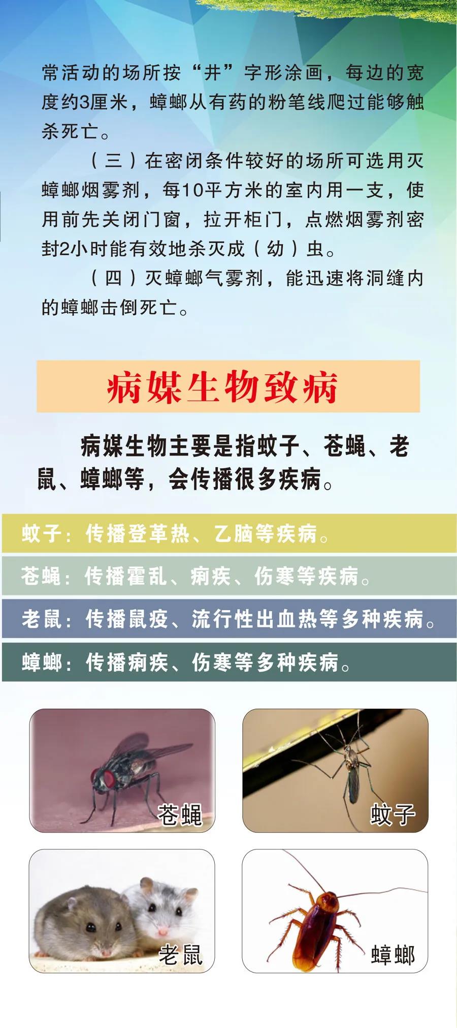 官渡区图书馆 发布于 2021-04-27 11:43 病媒生物指能直接或间接传播疾病(一般指人类疾病),危害、威胁人类健康的生物。广义的病媒生物包括脊椎动物和无脊椎动物,脊椎动物媒介主要是鼠类,属哺乳纲啮齿目动物;无脊椎动物媒介主要是昆虫纲的蚊、蝇、蟑螂、蚤等和蛛形纲的蜱、螨等。最常见四大害为:苍蝇、蚊子、老鼠、蟑螂。而螨虫无处不在,却不易为人察觉。病媒生物监测与防治是一项重要的民生工程,也是创建国家卫生城市的重要指标之一。 浏览 4164 次