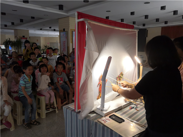 棕编蚂蚱和皮影戏小剧场则是非常具有中国传统文化特色的两场活动。棕编是我国传统手工技艺之一,是以棕榈树叶为原料编制的工艺品,距今已有200多年历史。2011年10月,棕编被列入“第三批国家级非物质文化遗产名录”。小读者们在老师的带领下,学习撕、拉、绕、穿、刺等方法,费了九牛二虎之力,终于将一片片新鲜的棕榈叶编成一只只小蚂蚱,虽然编出的蚂蚱样子还不太规范,甚至有点丑,但是孩子们都很喜爱自己辛苦编出的“劳动成果”。皮影戏是发源于我国西汉时期的世界上最早由人配音的活动影画艺术,为让小读者们有机会近距离体验这项非物质文化遗产,区图书馆设计了一场皮影戏小剧场的活动,带领孩子们制作自己的皮影人物并现场演绎西游记小故事,让孩子们生动感受了皮影戏的独特美感。两场传统文化活动都受到了小读者的喜爱,也把中国古代人民的聪明才智和传统的审美情趣“润物细无声”地传递到了孩子们的心里。